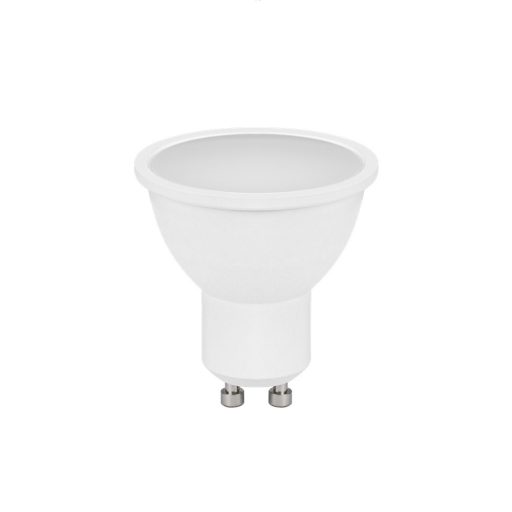 GU10-es típusú, 6W-os meleg fehér színhőmérsékletű LED fényforrás. Fényereje megegyezik kb. 42W-os hagyományos fényforráséval.