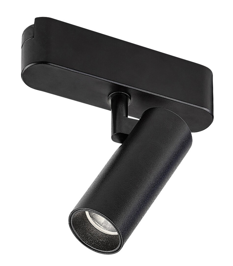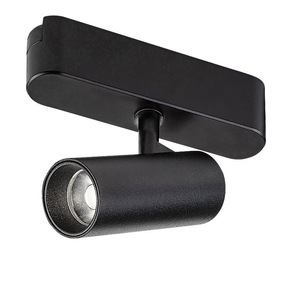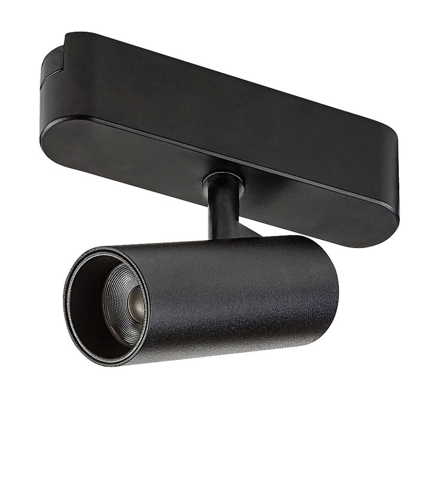 Fekete színű alumínium vázas, műanyag búrás sínre szerelhető, billenthető spot lámpa beépített, természetes fehér színhőmérsékletű LED fényforrással Rábalux LiTrack sínrendszeres lámpacsaládhoz.