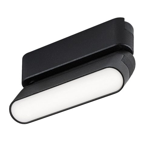 Fekete színű alumínium vázas, fehér műanyag búrás sínre szerelhető lámpa beépített, természetes fehér színhőmérsékletű LED fényforrással Rábalux LiTrack sínrendszeres lámpacsaládhoz. A lámpa feje billenthető, így a fény kis mértékben irányítható.