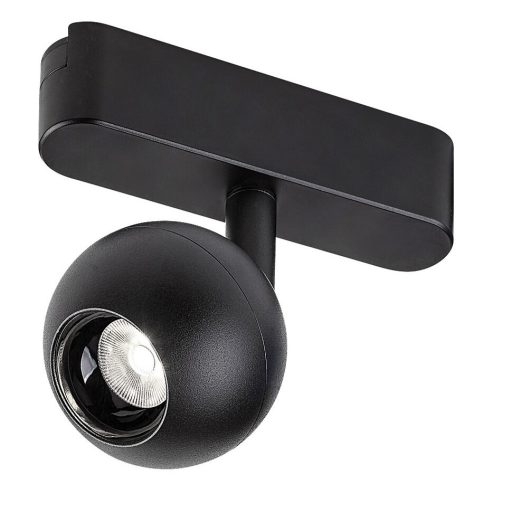 Fekete színű alumínium vázas, műanyag betétes sínre szerelhető, billenthető fejű spot lámpa természetes fehér színhőmérsékletű beépített LED fényforrással Rábalux LiTrack sínrendszeres lámpacsaládhoz.