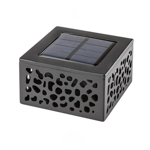 A modern stílusú, szögletes Medulin kültéri napelemes asztali lámpa remek választás lehet a teraszon elköltött kellemes vacsorákhoz és nyáresti beszélgetésekhez. A műanyagból készült, körös-körül szabálytalan mintákkal áttört fekete lámpatest rendkívül dekoratív. A Medulin beépített LED fényforrással rendelkezik, amelynek teljesítménye 0,5 W, fényereje búrával 8 lumen, búra nélkül 10 lumen, színhőmérséklete pedig 3000 K. A meleg fehér fénnyel világító fényforrás élettartama 12 500 óra. Az asztali lámpa szélessége 85 mm, magassága 50 mm. A Medulin napelemes lámpa IP44-es védettsége garantálja, hogy legfeljebb 1 mm átmérőjű tárgyak behatolása ellen, valamint bármilyen irányból fröccsenő víz ellen védett. Az AA típusú napelem feszültsége 1,2 V, kapacitása 600 mAh.