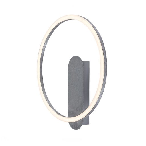 Ezüst színű súrolt alumínium vázas fali lámpa műanyag gyűrű alakú búrával, meleg fehér színhőmérsékletű beépített LED fényforrással.
