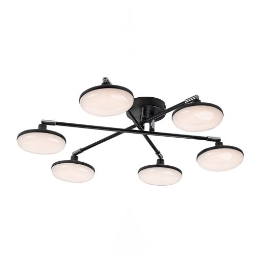 Fekete színű fém vázas mennyezeti lámpa króm elemekkel, billenthető, műanyag betétes búrával, meleg fehér színhőmérsékletű beépített LED fényforrással. A lámpa karjai forgathatóak.