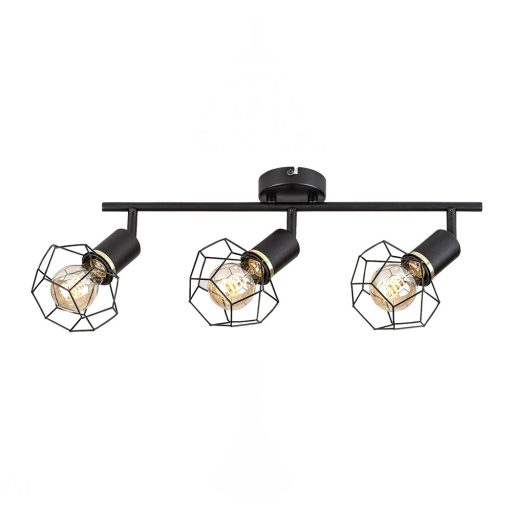 Fekete színű fém spot lámpa arany dekoros, fekete rácsos búrával, 3db E27-es foglalattal, billenthető fejjel.
