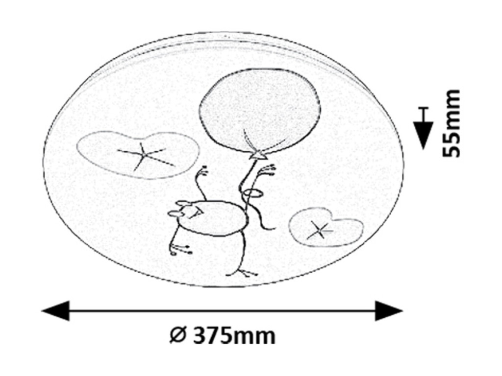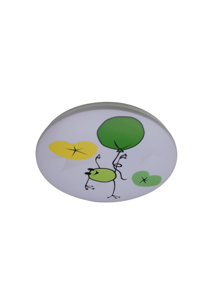 Fehér színű fém vázas mennyezeti lámpa fehér alapon béka és lufi mintás műanyag búrával, meleg fehér színhőmérsékletű beépített LED fényforrással.