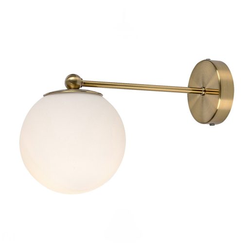 Arany színű fém vázas fali lámpa fehér színű, gömb alakú üveg búrával, E27-es foglalattal. A lámpa búra mérete miatt kisgömb(G45) fényforrás fér a lámpába, ami nem tartozék.