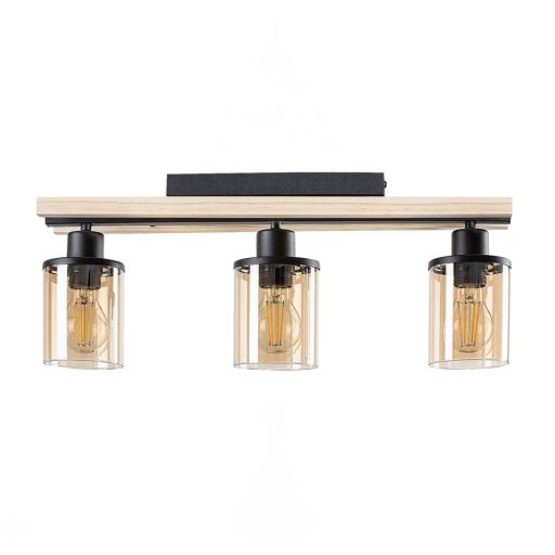 Fekete színű fém vázas mennyezeti lámpa világos fa dekorral és borostyán színű üveg búrával, E27-es foglalattal. A lámpa dekor fényforrással mutat a legjobban, ami nem tartozék.