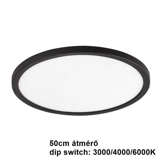 50cm átmérőjű fekete műanyag vázas mennyezeti lámpa fehér betéttel, beépített LED fényforrással. A lámpa színhőmérséklete a lámpán lévő kapcsoló segítségével felszereléskor állítható 3000,4000,6000K (meleg, természtes, hideg fehér) között.