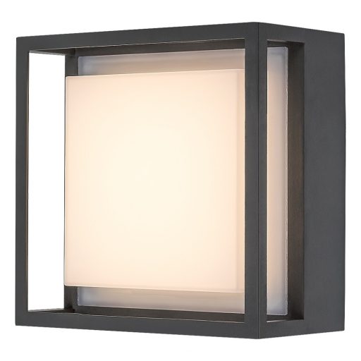 Modern megjelenésű kültéri fali lámpa beépített meleg fehér fényű LED fényforrással, 16x 16cm széles antracit színű fém kerettel és fehér színű műanyag lámpabúraval, IP65-ös védettséggel. A beépített, G energiaosztályba sorolt LED fényforrás 6,5W teljesítmény mellett 530 lumenes fényerőt biztosít. A lámpatestben a fényforrás nem cserélhető!