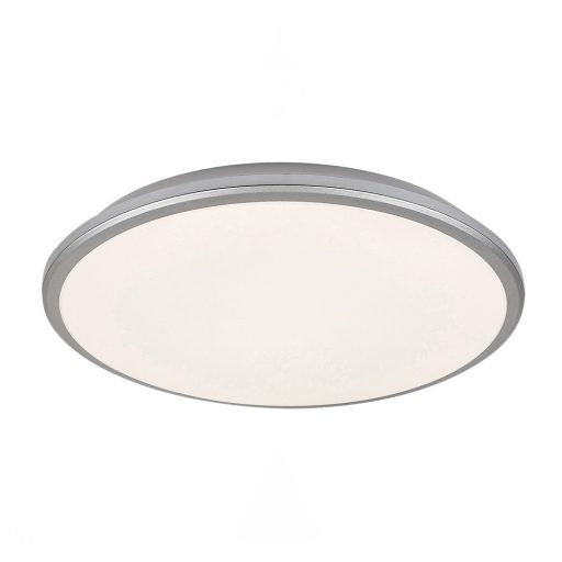 Ezüst dekor keretes, fehér színű műanyag mennyezeti lámpa természetes fehér színhőmérsékletű beépített LED fényforrással, 38cm átmérővel.
