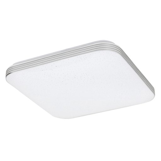 Fehér színű fém vázas mennyezeti lámpa króm dekor szegélyes, fehér, csillagos égbolt effektes műanyag búrával, természetes fehér színhőmérsékletű beépített LED fényforrással.