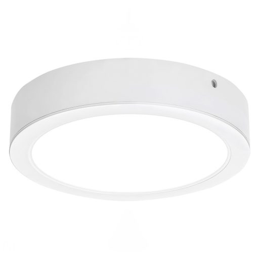 12cm átmérőjű, fehér színű műanyag mennyezetre szerelhető lámpa természetes fehér színhőmérsékletű beépített LED fényforrással.