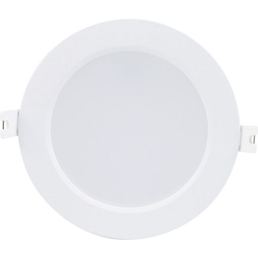 12cm átmérőjű, fehér színű műanyag mennyezetbe építhető lámpa meleg fehér színhőmérsékletű beépített LED fényforrással.