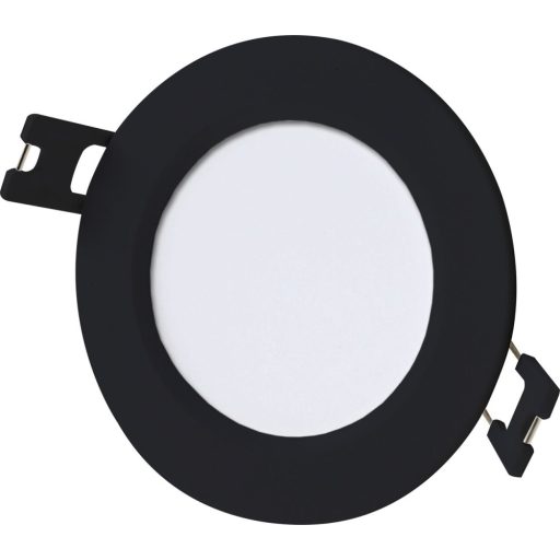 9cm átmérőjű, fehér és fekete színű műanyag mennyezetbe építhető lámpa meleg fehér színhőmérsékletű beépített LED fényforrással.