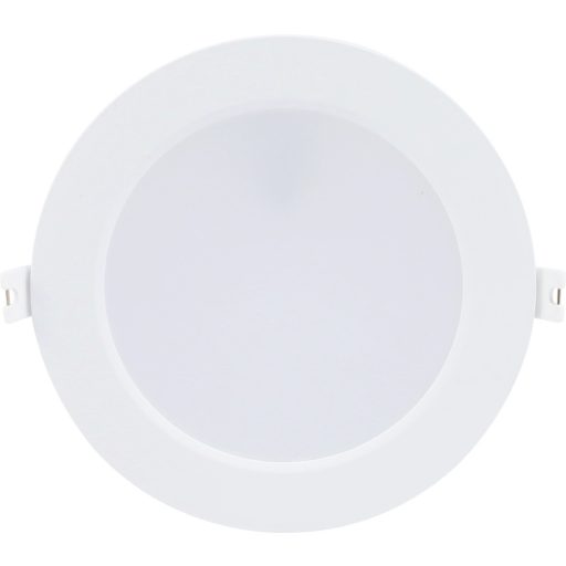 17cm átmérőjű, fehér színű műanyag mennyezetbe építhető lámpa természetes fehér színhőmérsékletű beépített LED fényforrással.