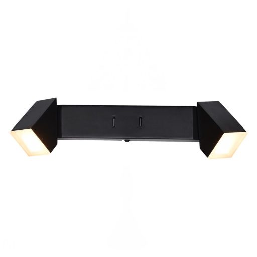 Fekete színű fém fali lámpa fehér műanyag betétes búrával, mozgatható fejjel, meleg fehér színhőmérsékletű beépített LED fényforrással. A két fej külön kapcsolható a lámpatesten található kapcsolók segítségével.