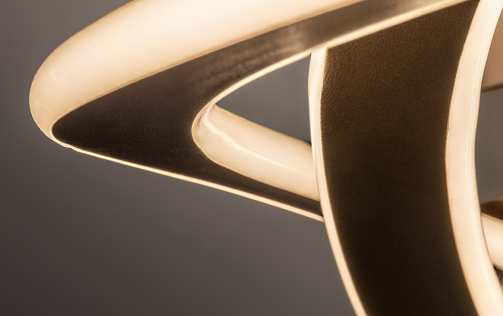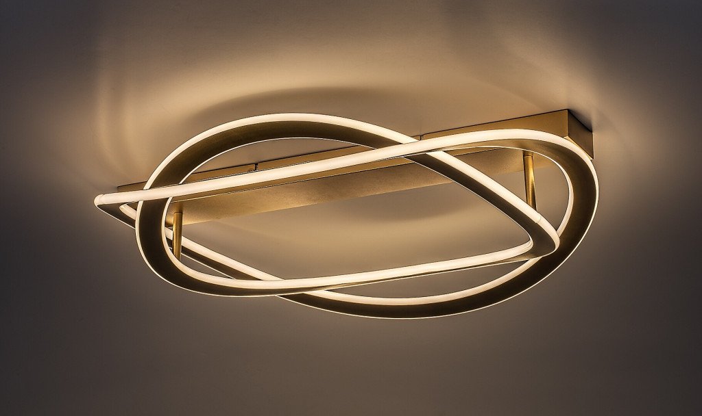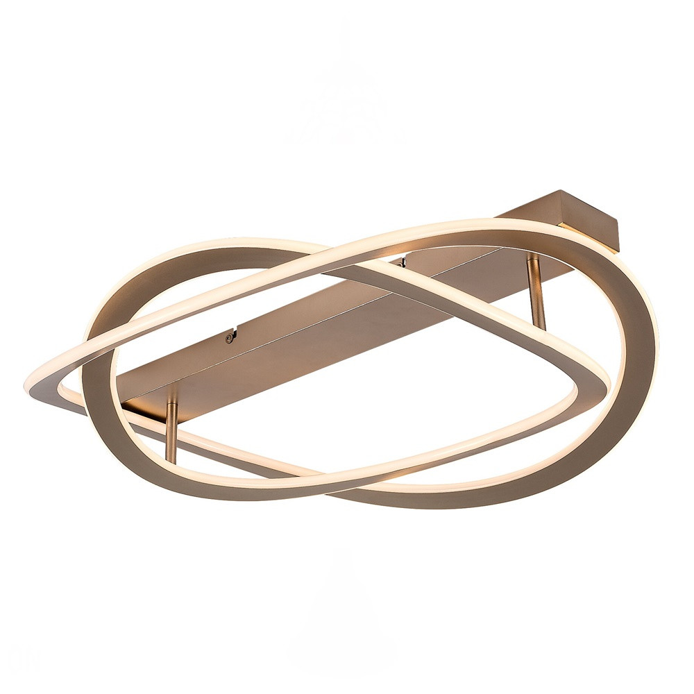Arany színű fém vázas mennyezeti lámpa, ívelt, fehér szilikon betétes búrával, meleg fehér színhőmérsékletű beépített LED fényforrással.