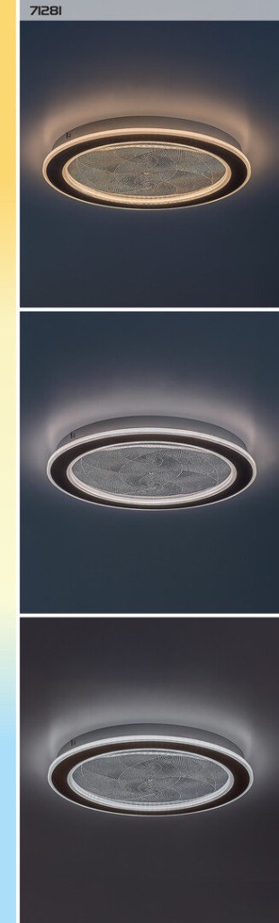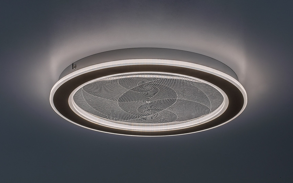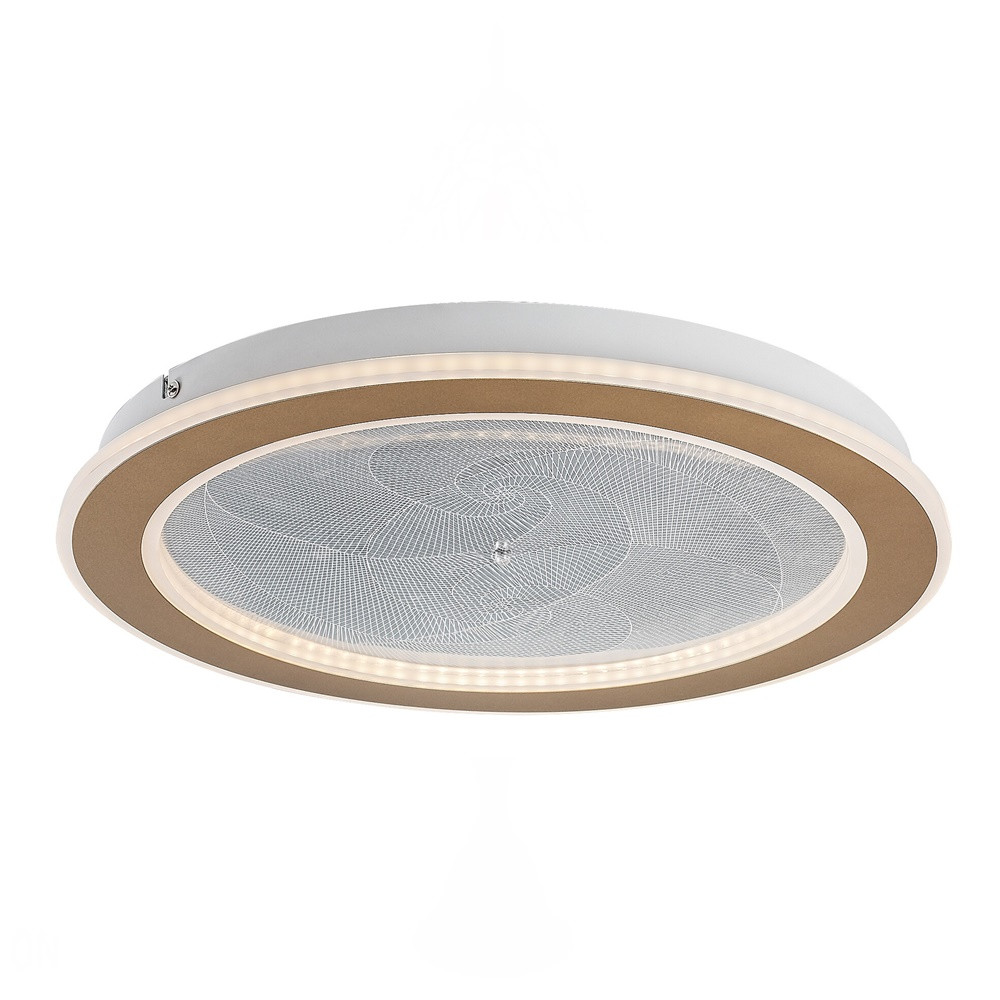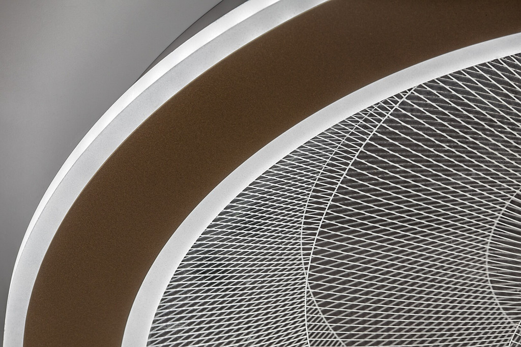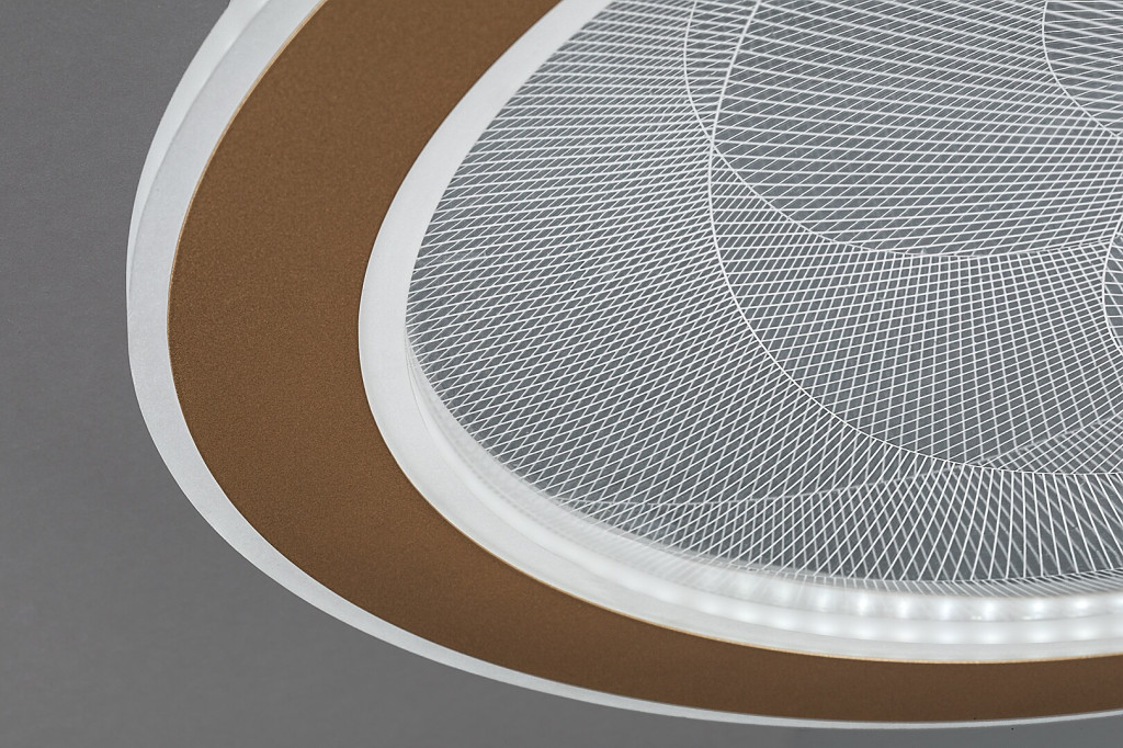 Arany színű fém vázas mennyezeti lámpa, dekoratív, átlátszó acryl búrával, melynek gravírozott mintája felkapcsoláskor világít. A lámpa beépített LED fényforrással rendelkezik. A lámpához távirányító tartozik, mely segítségével állítható a LED fényereje, a színhőmérséklete (3000-6500K, azaz melegtől-hideg fehér). Szintén a távirányítóval időzíthető, illetve éjszakaia fény funkióval és memória funkcióval is rendelkezik.
