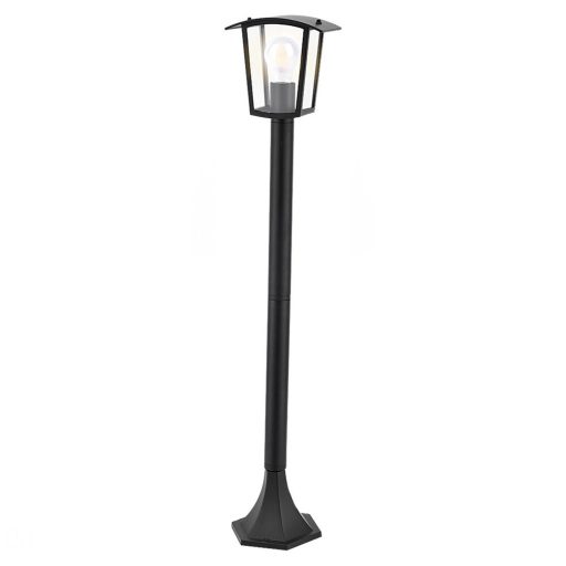 Fekete színű fém vázas kültéri álló lámpa átlátszó műanyag búrával, IP44-es védelemmel, 1db E27-es foglalattal.