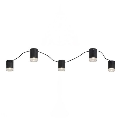 5db sorba kötött fekete színű fém mennyezeti lámpa akril betéttel, G9-es foglalattal. A lámpák a vezeték adta határokon belül tetszőlegesen felszerelhetőek. A lámpa maximális hossza 230cm. A lámpák átmérője egyenként 9cm, magasságuk 13cm.