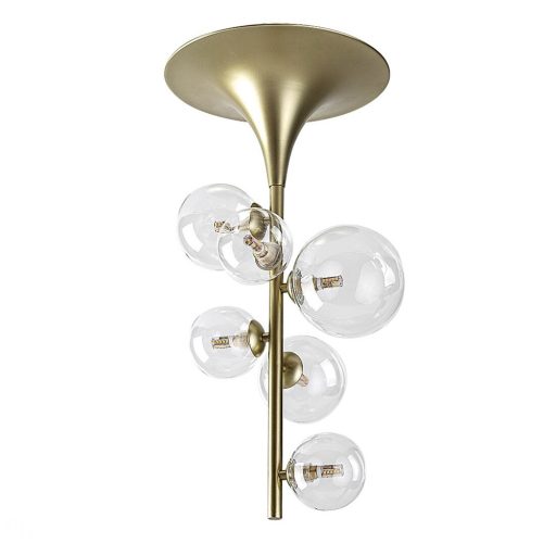 Arany színű fém vázas mennyezeti lámpa 10,12 és 15cm átmérőjű átlátszó üveg búrával, G9-es foglalattal. Max. 5,5cm hosszú G9-es fényforrás fér el a búrákban.