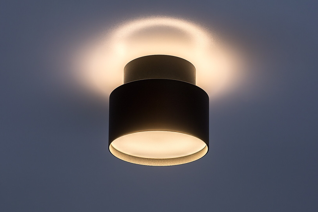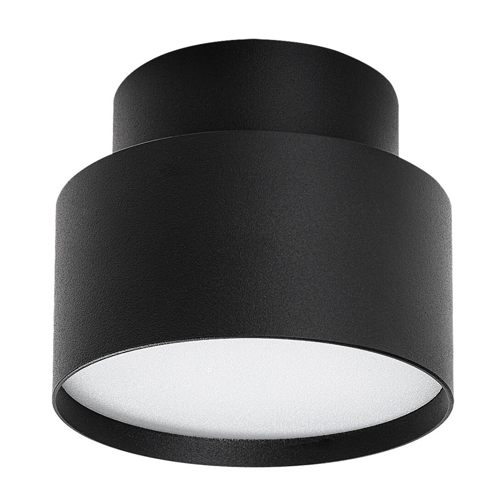 Fekete színű fém 11cm átmérőjű mennyezeti lámpa fehér műanyag betéttel, meleg fehér színhőmérsékletű beépített LED fényforrással, háttérfény funkcióval.