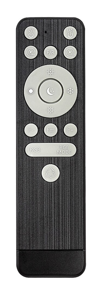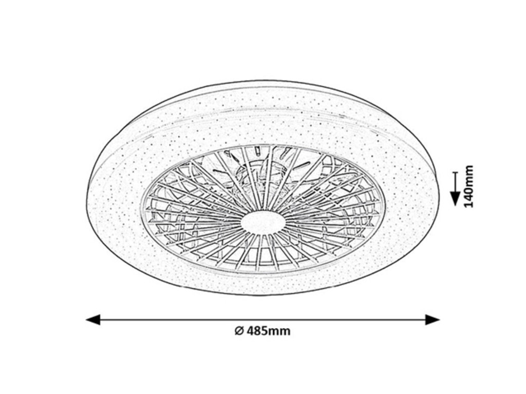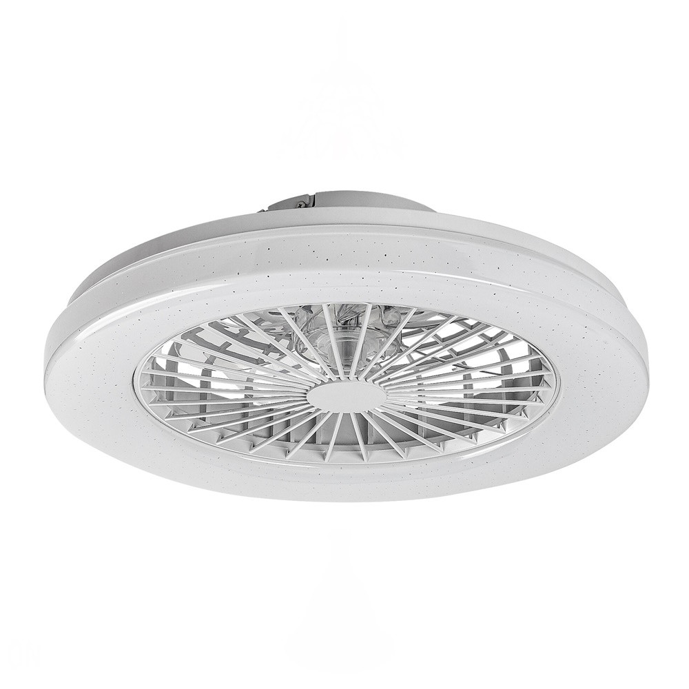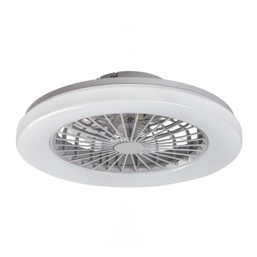 Ventilátoros mennyezeti lámpa fehér színben fém vázzal és csillagos égbolt effektes műanyag búrával, beépített LED fényforrással. A lámpához távirányító tartozik, mely segítségével állíható a lámpa fényereje, színhőmérséklete (3000-6500K, azaz meleg-hideg fehér) és színe. A lámpa továbbá időzítő, memória és éjszakai fény funkcióval is rendelkezik. A színhőmérséklet fali kapcsolóval is állítható. A lámpa közepén 15W teljesítményű, 5 fokozatban állítható ventilátor található percenkénti max. 1005 fordulatszámmal, 50dB hangkibocsátással. A ventilátor 33 négyzetméteres helyiségbe elegendő.