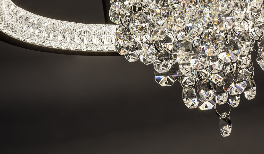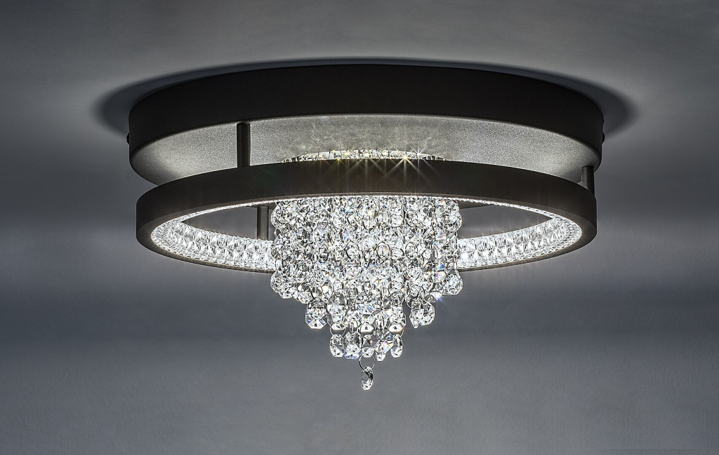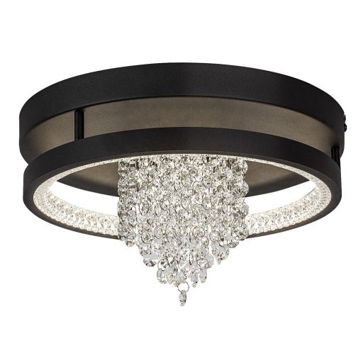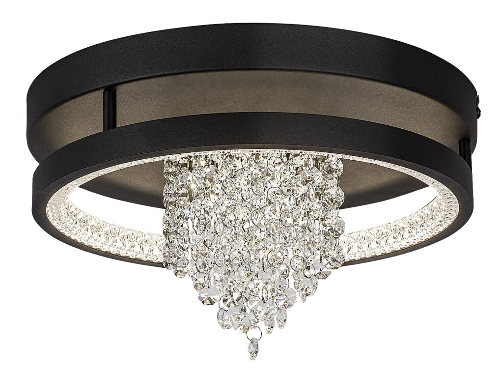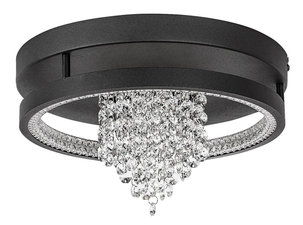 Fekete színű fém mennyezeti lámpa műanyag betétes búrával, üveg kristály dekorral, beépített LED fényforrással. A LED színhőmérséklete a lámpatesten elhelyezkedő kapcsoló segítségével állítható 3000/3500/4000 Kelvinre azaz meleg vagy természetes fehér színhőmérsékletre.