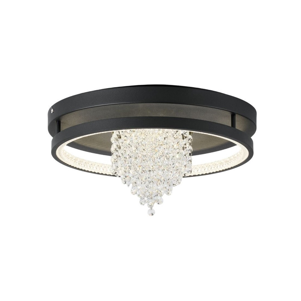 Fekete színű fém mennyezeti lámpa műanyag betétes búrával, üveg kristály dekorral, beépített LED fényforrással. A LED színhőmérséklete a lámpatesten elhelyezkedő kapcsoló segítségével állítható 3000/3500/4000 Kelvinre azaz meleg vagy természetes fehér színhőmérsékletre.