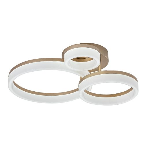 Arany színű fém mennyezeti lámpa fehér műanyag búrával, beépített LED fényforrással. A lámpa színhőmérséklete a mennyezet rózsa oldalán lévő kapcsoló segítségével állítható 3000/4000/6500K-re, azaz meleg/természetes/hideg fehér színhőmérsékletre.
