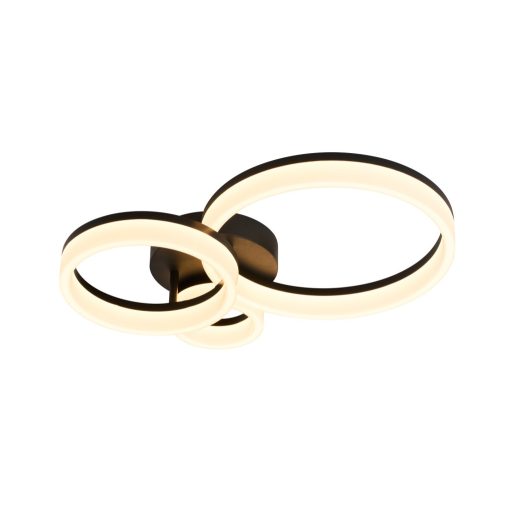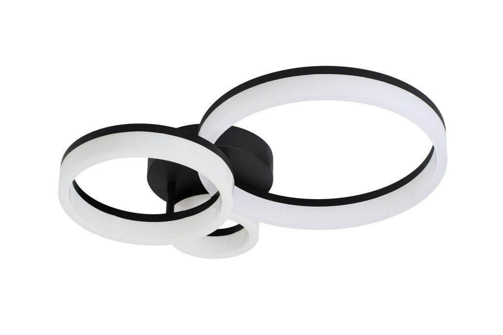 Fekete színű fém mennyezeti lámpa fehér műanyag búrával, beépített LED fényforrással. A lámpa színhőmérséklete a mennyezet rózsa oldalán lévő kapcsoló segítségével állítható 3000/4000/6500K-re, azaz meleg/természetes/hideg fehér színhőmérsékletre.