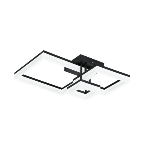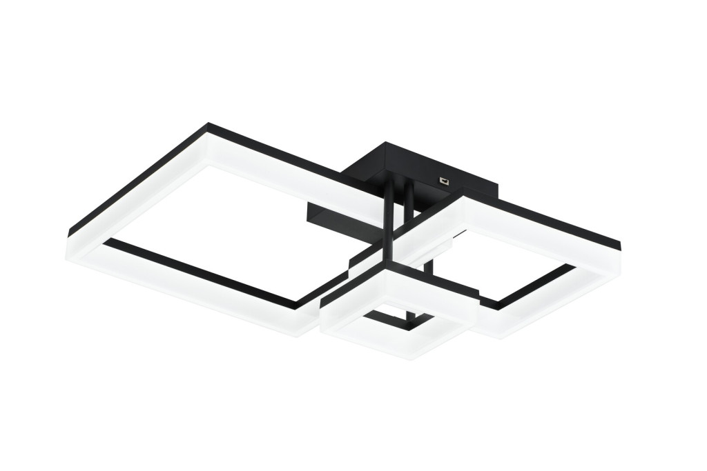 Fekete színű fém mennyezeti lámpa fehér műanyag búrával, beépített LED fényforrással. A lámpa színhőmérséklete a mennyezet rózsa oldalán lévő kapcsoló segítségével állítható 3000/4000/6500K-re, azaz meleg/természetes/hideg fehér színhőmérsékletre.