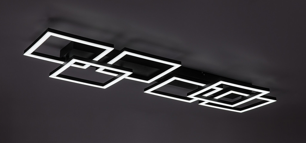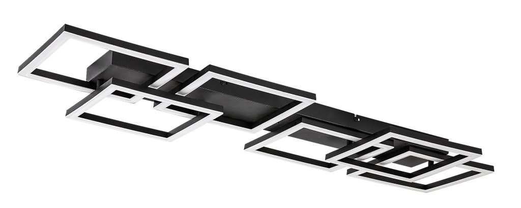 Fekete színű fém mennyezeti lámpa fehér műanyag betétes búrával, beépített LED fényforrással. A lámpához távirányító tartozik, mely segítségével állíható a lámpa fényereje, színhőmérséklete (3000-6500K, azaz meleg-hideg fehér). A lámpa továbbá időzítő, memória és éjszakai fény funkcióval is rendelkezik.
