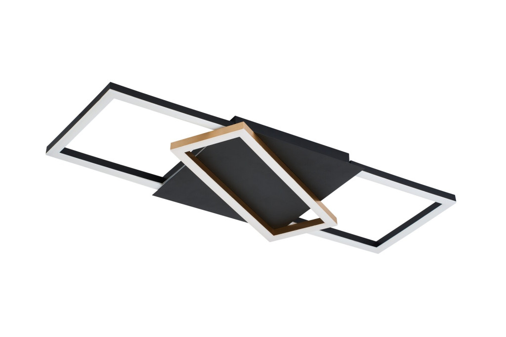 Fekete színű fém mennyezeti lámpa fekete és arany színű fém, fehér műanyag betétes búrával, beépített LED fényforrással. A lámpához távirányító tartozik, mely segítségével állíható a lámpa fényereje, színhőmérséklete (3000-6500K, azaz meleg-hideg fehér). A lámpa továbbá időzítő, memória és éjszakai fény funkcióval is rendelkezik.