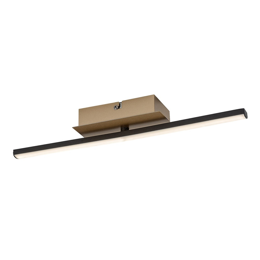 Arany színű fém mennyezeti lámpa fekete fém, fehér műanyag betétes búrával, beépített, természetes fehér színhőmérsékletű LED fényforrással.
