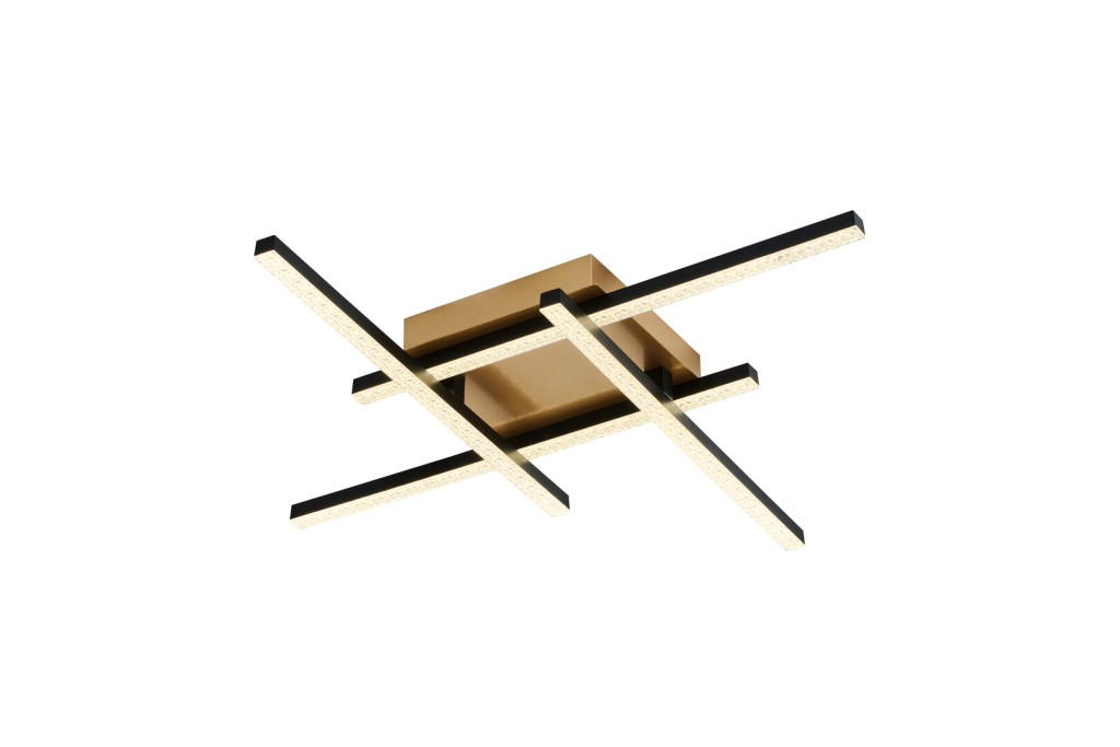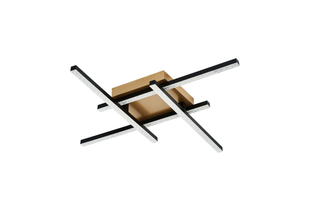 Arany színű fém mennyezeti lámpa fekete fém, fehér műanyag betétes búrával, beépített, természetes fehér színhőmérsékletű LED fényforrással.