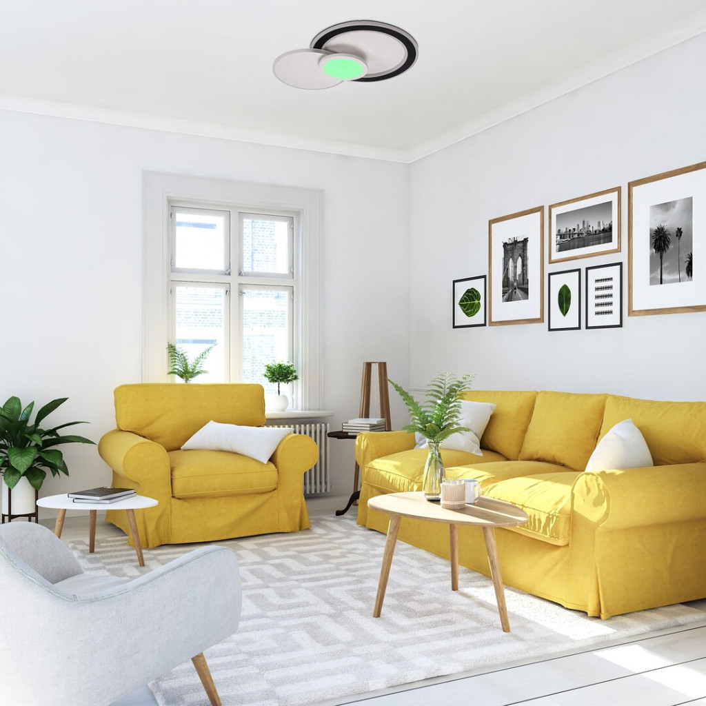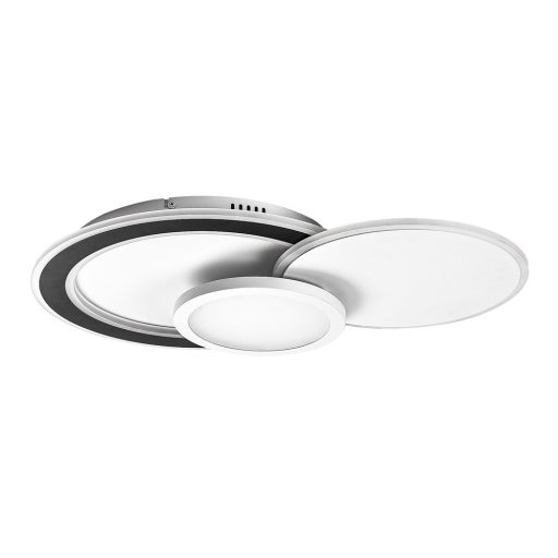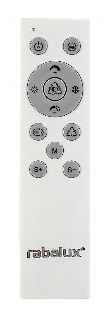 Fekete színű fém vázas mennyezeti lámpa fehér színű műanyag búrával, beépített LED fényforrással. A lámpához távirányító tartozik, mely segítségével állíható a lámpa fényereje, színhőmérséklete (3000-6500K, azaz meleg-hideg fehér) és színe. A lámpa továbbá memória funkcióval is rendelkezik.