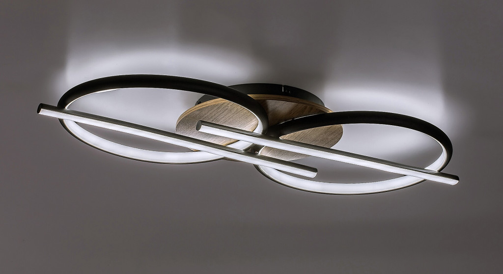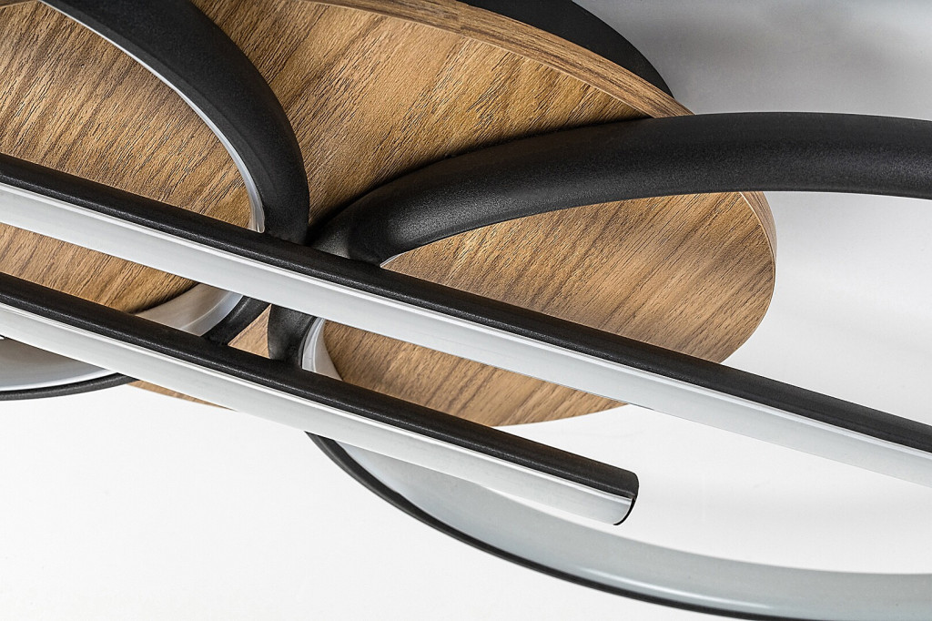 Fekete színű fém és tölgyfa vázas mennyezeti lámpa fehér műanyag betétes búrával, beépített LED fényforrással. A lámpa színhőmérséklete fali kapcsoló többszöri fel/le kapcsolásával állítható 3000/4000/6500K-re, azaz meleg/természetes/hideg fehér színhőmérsékletre.
