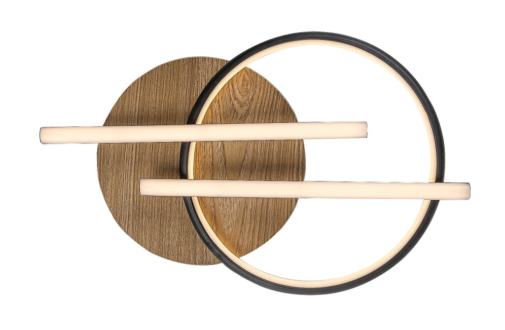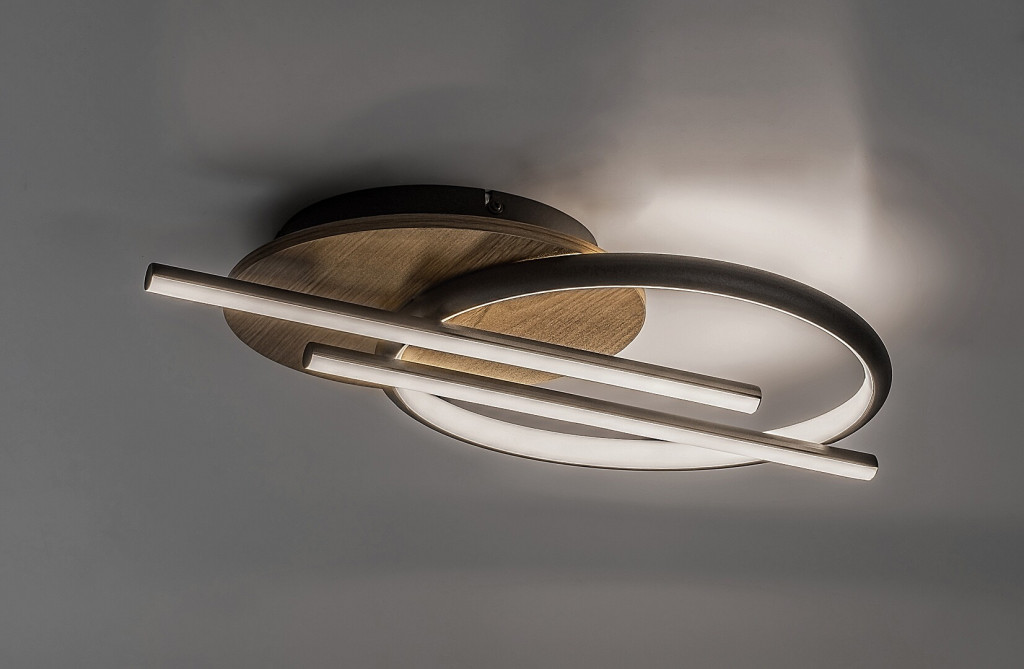Fekete színű fém és tölgyfa vázas mennyezeti lámpa fehér műanyag betétes búrával, beépített LED fényforrással. A lámpa színhőmérséklete fali kapcsoló többszöri fel/le kapcsolásával állítható 3000/4000/6500K-re, azaz meleg/természetes/hideg fehér színhőmérsékletre.