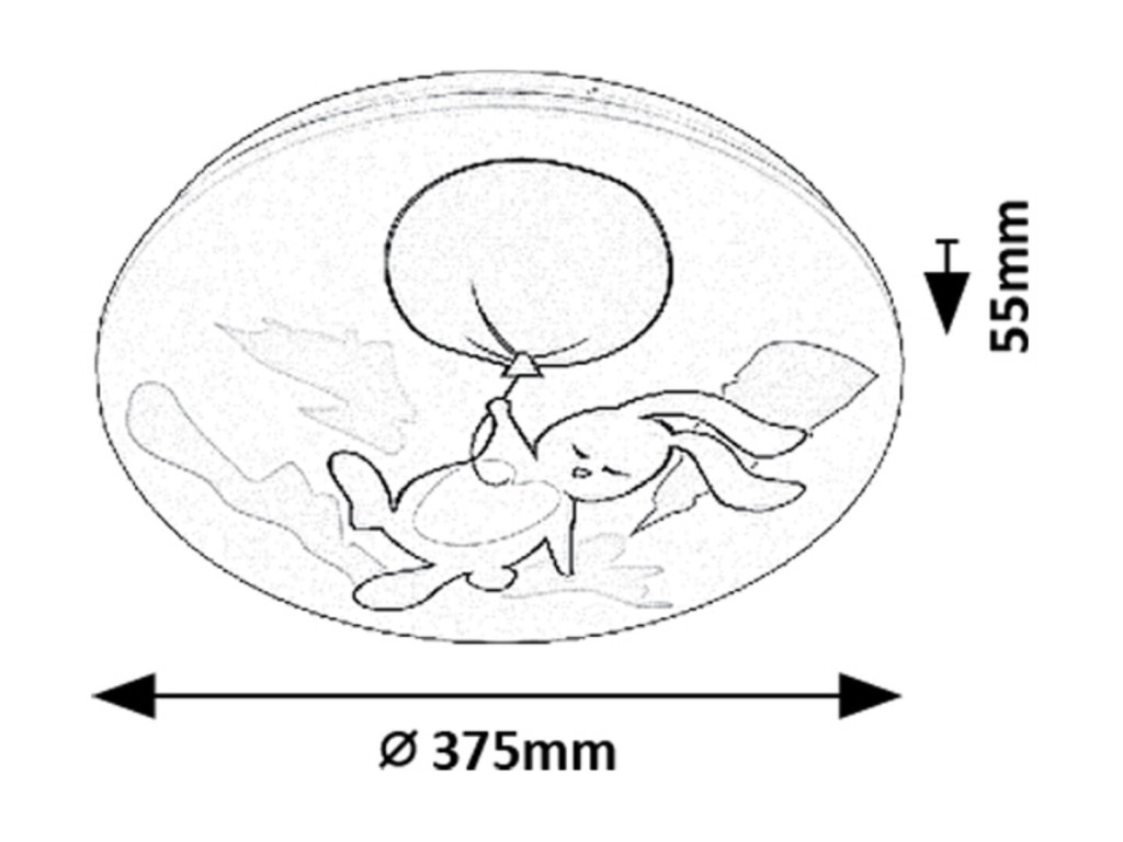 Fehér színű fém vázas mennyezeti lámpa fehér alapon nyuszi és lufi mintás műanyag búrával, meleg fehér színhőmérsékletű beépített LED fényforrással.