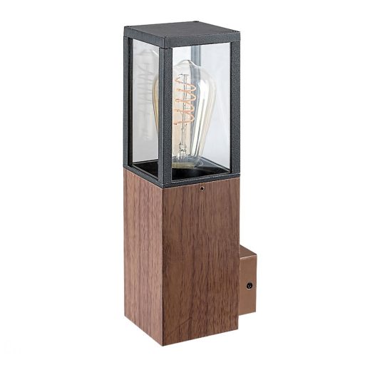 Tölgy színű fa imitációs fém kültéri fali lámpa átlátszó üveg betéttel, 1db E27-es foglalattal, IP44-es védelemmel. A lámpát fényforrás nélkül szállítjuk.
