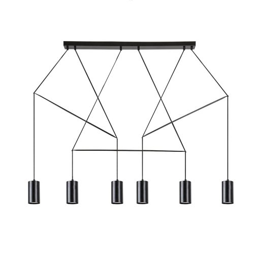 Fémből készült matt fekete függeszték lámpa henger formájú fém fejekkel, GU10-es foglalattal, textil kábellel.