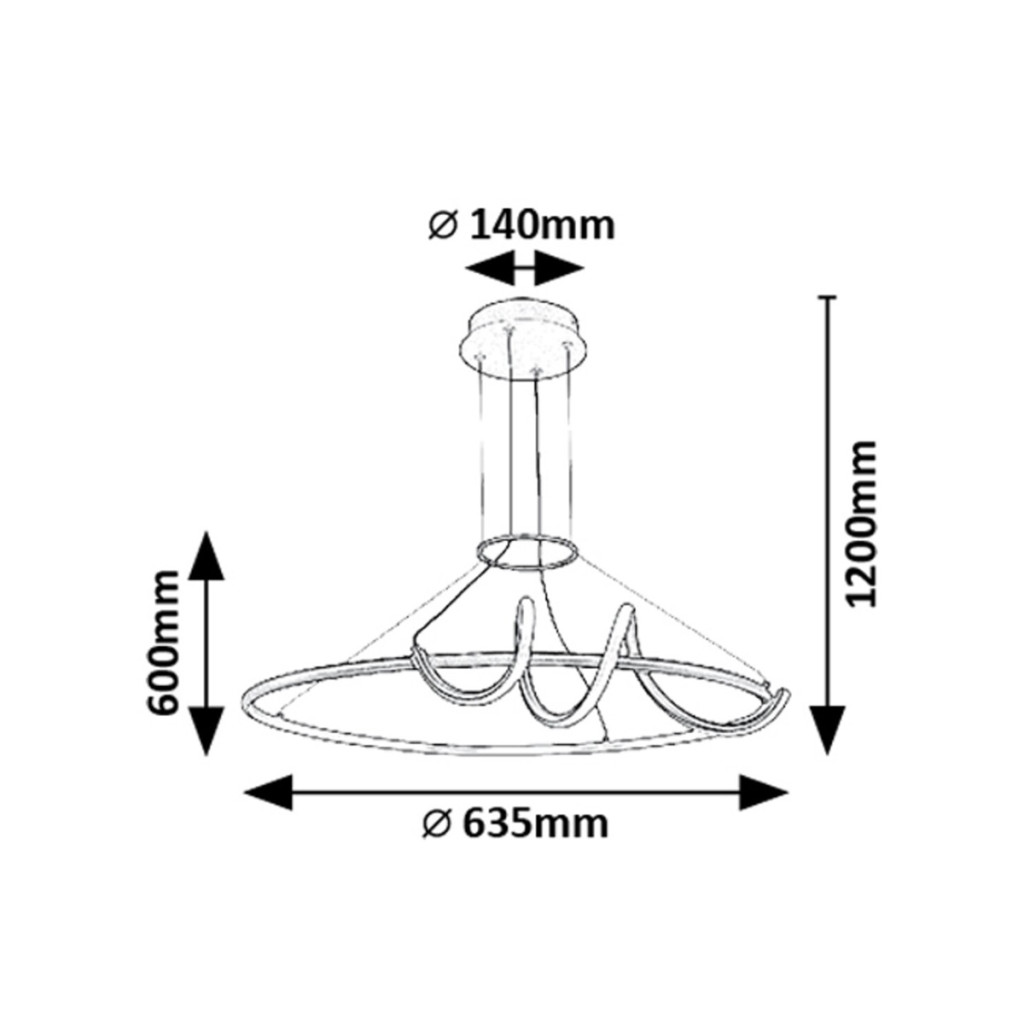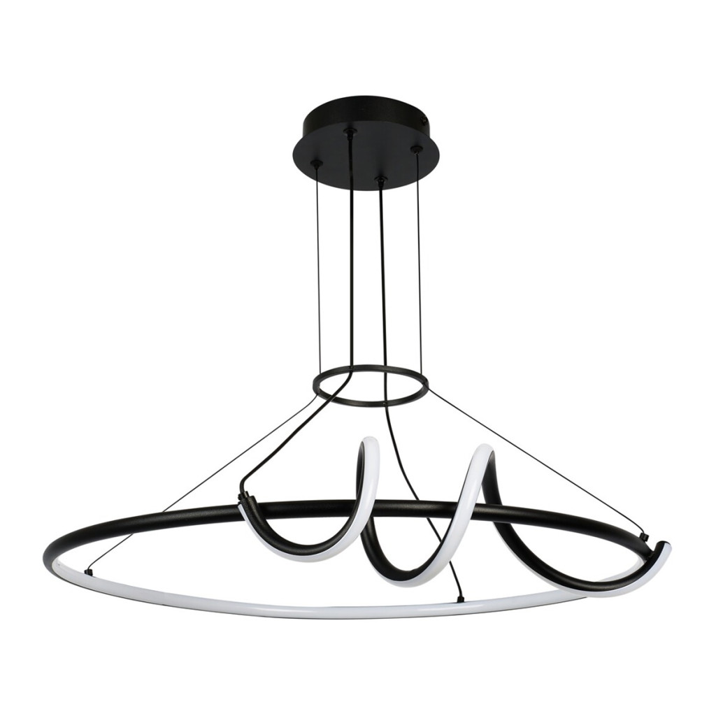 Fekete színű fém vázas függesztett lámpa egy gyűrű alakban tekergő, fehér szilikon betétes búrával, beépített LED fényforrással. A lámpához távirányító tartozék, mely segítségével állítható a lámpa fényereje, színhőmérséklete (3000-6500K, azaz meleg-hideg fehér). A lámpa továbbá időzítő, éjszakai fény és memória funkcióval is rendelkezik.