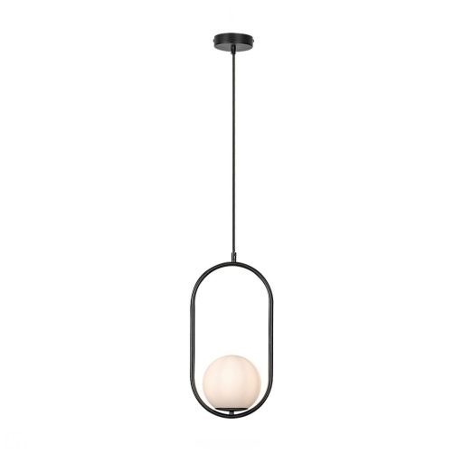 Fekete színű fém vázas függszték lámpa gömb alakú opál üveg búrával, E27-es foglalattal.