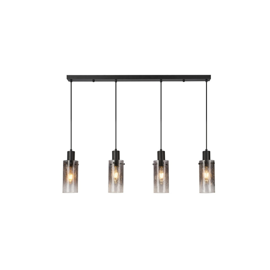 Fekete színű fém vázas függesztett lámpa töredezett hatású, füstszínű üveg búrával, E27-es foglalattal.