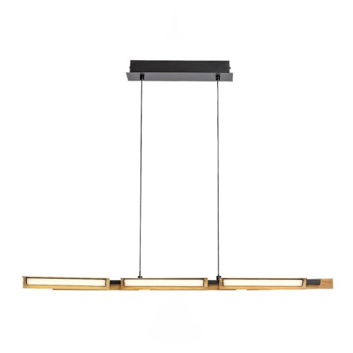 Matt fekete és bükk színű fém vázas függeszték lámpa műanyag betétes búrával, beépített, meleg fehér színhőmérsékletű LED fényforrással.