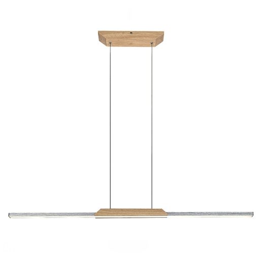 Világos fa és súrolt alumínium vázas függeszték lámpa műanyag betétes búrával, természetes fehér színhőmérsékletű beépített LED fényforrással.