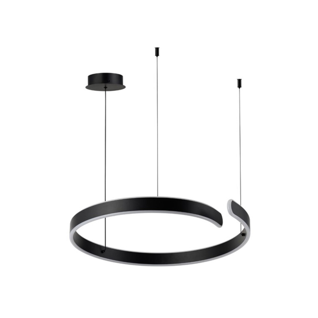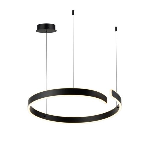 Fekete színű fém vázas függesztett lámpa 57cm átmérőjű, gyűrű alakú, fehér szilikon betétes búrával, beépített LED fényforrással. A lámpa színhőmérséklete a mennyezet rózsa oldalán lévő kapcsoló segítségével állítható 3000/4000/6500K-re, azaz meleg/természetes/hideg fehér színhőmérsékletre.
