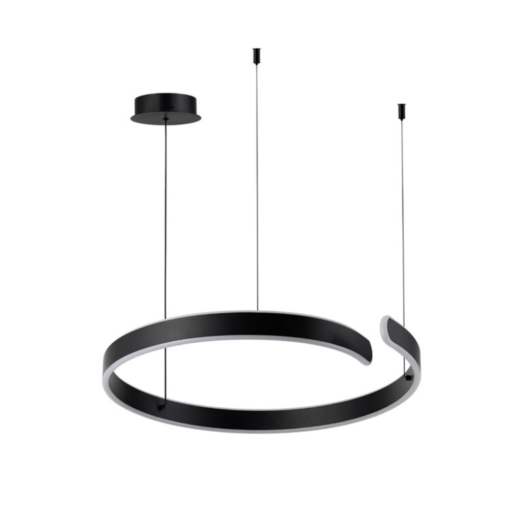 Fekete színű fém vázas függesztett lámpa 76cm átmérőjű, gyűrű alakú, fehér szilikon betétes búrával, beépített LED fényforrással. A lámpa színhőmérséklete a mennyezet rózsa oldalán lévő kapcsoló segítségével állítható 3000/4000/6500K-re, azaz meleg/természetes/hideg fehér színhőmérsékletre.