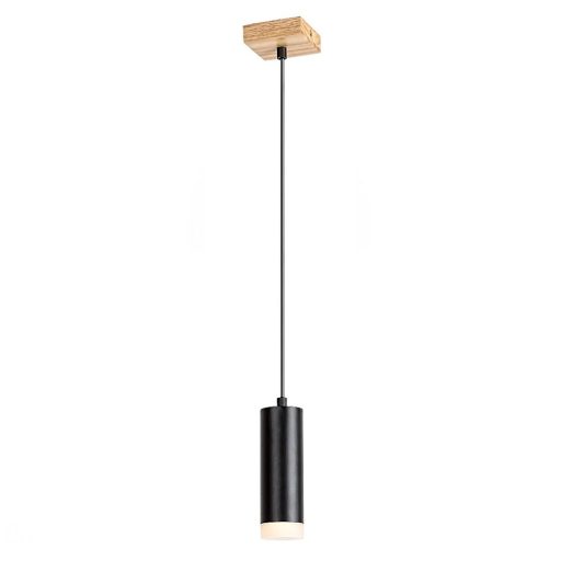 Tölgy színű fa és fekete színű fém függeszték lámpa opálos műanyag gyűrűvel, GU10-es foglalattal. A lámpát fényforrás nélkül szállítjuk.